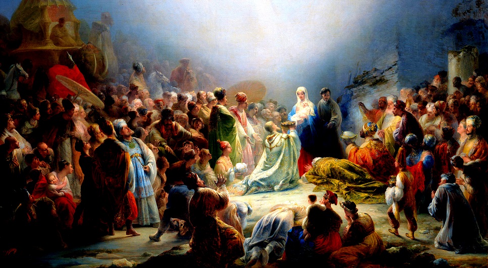 El sagrado misterio de la Epifanía está referido en el evangelio de san Mateo. Al llegar los magos a Jerusalén, éstos preguntaron en la corte el paradero del "Rey de los judíos". Los maestros de la ley supieron informarles que el Mesías del Señor debía nacer en Belén, la pequeña ciudad natal de David; sin embargo fueron incapaces de ir a adorarlo junto con los extranjeros. Los magos, llegados al lugar donde estaban el niño con María su madre, ofrecieron oro, incienso y mirra, sustancias preciosas en las que la tradición ha querido ver el reconocimiento implícito de la realeza mesiánica de Cristo (oro), de su divinidad (incienso) y de su humanidad (mirra).