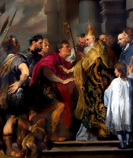 El emperador de ese tiempo era Teodosio, un creyente católico, gran guerrero, pero que se dejaba llevar por sus arrebatos de cólera. Un día los habitantes de la ciudad de Tesalónica mataron a un empleado del emperador, y éste envió a su ejército y mató a siete mil personas. Esta noticia conmovió a todos. San Ambrosio se apresuró a escribirle una fuerte carta al mandatario diciéndole: "Eres humano y te has dejado vencer por la tentación. Ahora tienes que hacer penitencia por este gran pecado". El emperador le escribió diciéndole: "Dios perdonó a David; luego a mí también me perdonará". Y nuestro santo le contestó: "Ya que has imitado a David en cometer un gran pecado, imítalo ahora haciendo una gran penitencia, como la que hizo él".