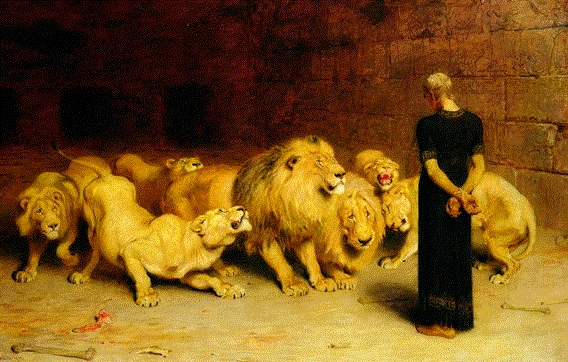 Los enemigos de la religión acusaron a Daniel porque tres veces cada día se arrodillaba en la azotea de su casa a adorar y rezar a Dios. En castigo fue echado al foso donde había leones sin comer. Pero Dios hizo el milagro de que los leones no lo atacaran, y esto hizo que el rey creyera en el verdadero Dios.