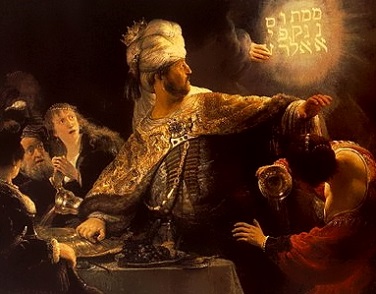 El rey Baltasar cometió el pecado de emplear los cálices sagrados del altar de Dios para tomar licor en una fiesta, y estando en esto apareció una mano misteriosa que escribía tres palabras en la pared: Mene, Tequel, Uparsin. El rey se asustó mucho y el profeta Daniel le explicó: "Mene significa pesado. Es que Dios ha pesado sus obras y han resultado faltas de peso para recibir premios. Tequel significa medido. Dios midió sus obras y no dan la medida para recibir gloria. Uparsin significa dividido. Es que su reino será dividido y pasado a otros".