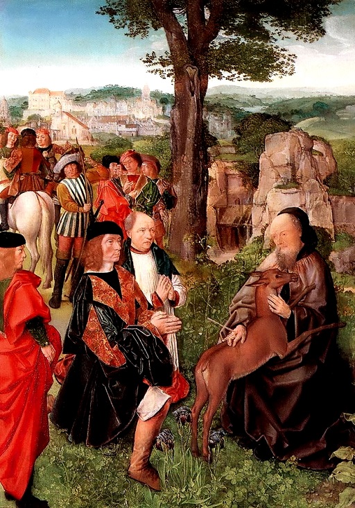 Se le consideró uno de los "14 santos auxiliares". Se le representa como anacoreta, con varios atributos: cierva, lirio, flecha clavada en el brazo, dos puertas (regalo del Papa a su monasterio) y un mensaje celeste en una filacteria por haber descubierto un pecado oculto del Rey Carlos y hacérselo confesar.