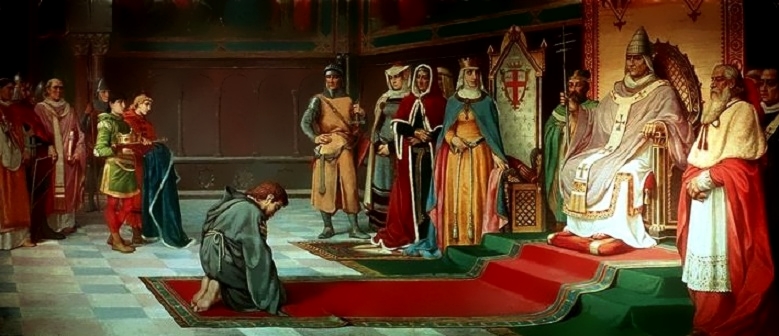Cuando Enrique IV se sintió perdido se fue como humilde peregrino a visitar al Papa, que estaba en el castillo de Canossa, y allá, vestido de penitente, estuvo por tres días en las puertas, entre la nieve, suplicando que el Sumo Pontífice lo recibiera y lo perdonara. Gregorio VII sospechaba que eso era un engaño hipócrita del emperador, para no perder su puesto, pero fueron tantos los ruegos de sus amigos y vecinos que al fin lo recibió, le oyó su confesión, le perdonó y le quitó la excomunión.