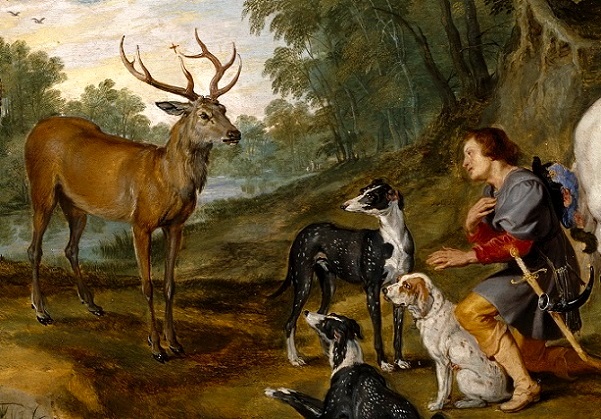 Humberto olvidó los sabios consejos de su santa madre y se dedicó únicamente a fiestas y deportes y dejó de asistir al templo. Y un Viernes Santo en vez de ir a las ceremonias religiosas se fue de cacería. Pero sucedió que yendo en pleno bosque persiguiendo un venado, éste se detuvo repentinamente y los perros y los caballos saltaron asustados hacia atrás. Entre los cuernos del venado apareció una cruz luminosa y Humberto oyó una voz que le decía: "Si no vuelves hacia Dios, caerás en el infierno".