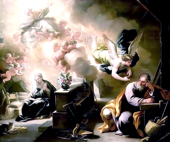 En su primer sueño, en Nazaret, un ángel le contó que el hijo que iba a tener María era obra del Espíritu Santo y que podía casarse tranquilamente con Ella, que era totalmente fiel. Tranquilizado con ese mensaje, José celebró sus bodas. La leyenda cuenta que doce jóvenes pretendían casarse con María, y que cada uno llevaba en su mano un bastón de madera muy seca. Y que en el momento en que María debía escoger entre los 12, he aquí que el bastón que José llevaba milagrosamente floreció. Por eso pintan a este santo con un bastón florecido en su mano.