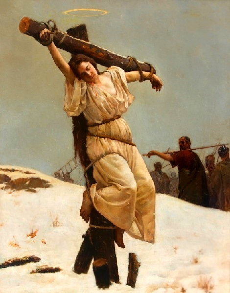 Entonces el juez pagano mandó que la destrozaran golpeándola con varillas de hierro y que sobre sus heridas colocaran antorchas encendidas. La hermosa cabellera de Eulalia se incendió y la jovencita murió quemada y ahogada por el humo.