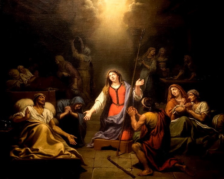 Después llegó a París una espantosa escasez y carestía y la gente se moría de hambre. Genoveva en vez de quejarse reunió un buen grupo de hombres y se fue río arriba buscando víveres y volvió con las barcas llenas de comestibles y así salvó una vez más la ciudad.