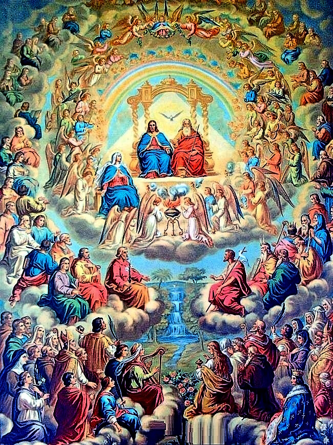 La Iglesia nos manda echar en este día una mirada al cielo, que es nuestra futura patria, para ver allí con San Juan, a esa turba magna, a esa muchedumbre incontable de Santos, figurada en esas series de 12,000 inscritos en el Libro de la Vida, - con el cual se indica un número incalculable y perfecto, - y procedentes de Israel y de toda nación, pueblo y lengua, los cuales revestidos de blancas túnicas y con palmas en las manos, alaban sin cesar al Cordero sin mancilla. Cristo, la Virgen, los nueve coros de ángeles, los Apóstoles y Profetas, los Mártires con su propia sangre purpurados, los Confesores, radiantes con sus blancos vestidos, y los castos coros de Vírgenes forman ese majestuoso cortejo, integrado por todos cuantos acá en la tierra se desasieron de los bienes caducos y fueron mansos, mortificados, justicieros, misericordiosos, puros, pacíficos y perseguidos por Cristo. Entre esos millones de Justos a quienes hoy honramos y que fueron sencillos fieles de Jesús en la tierra, están muchos de los nuestros, parientes, amigos, miembros de nuestra familia parroquial, a los cuales van hoy dirigidos nuestros cultos. Ellos adoran ya al Rey de reyes y Corona de todos los Santos y seguramente nos alcanzarán abundantes misericordias de lo alto.